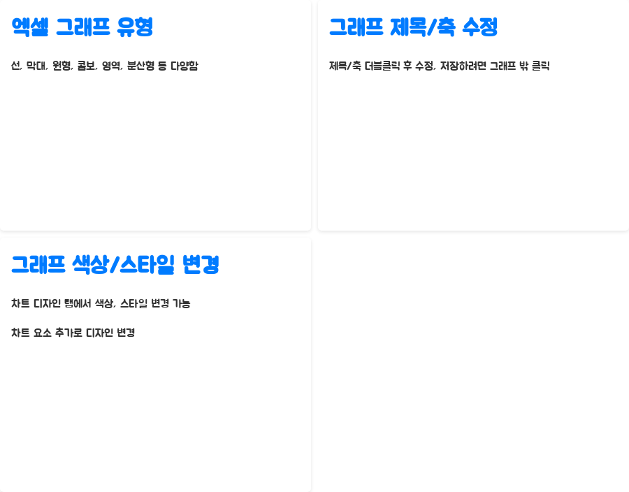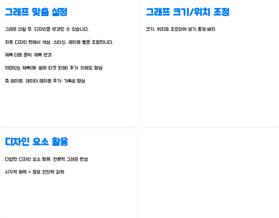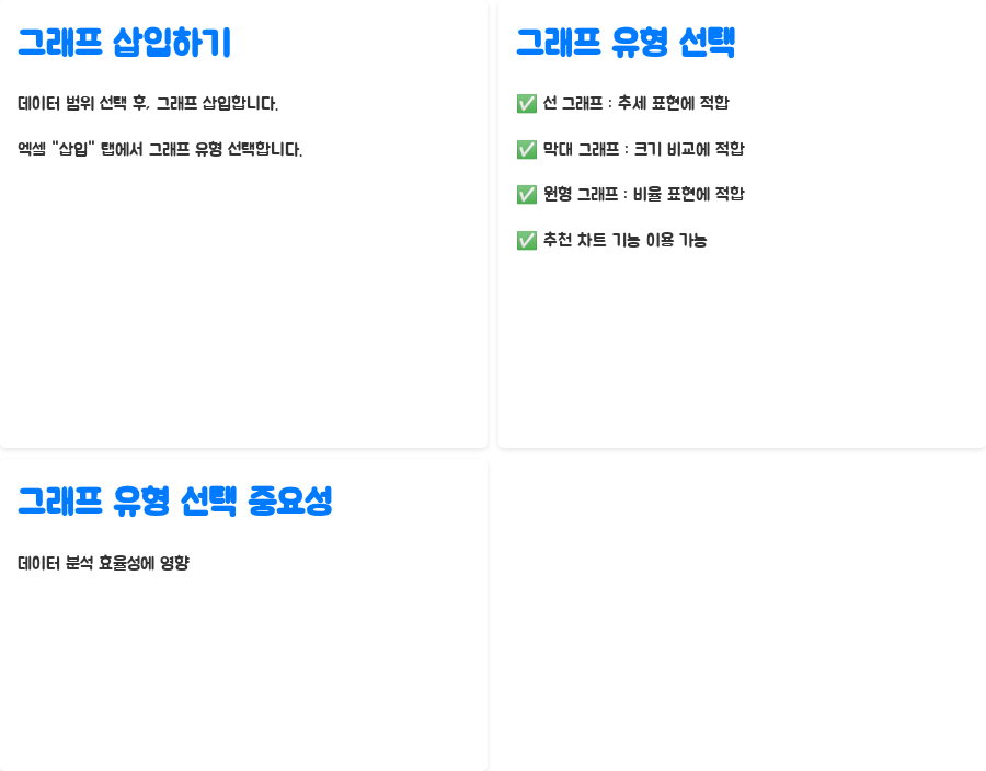 | 그래프 삽입 | 삽입 탭에서 원하는 그래프 유형 선택 | 데이터 특성과 표현 목적에 맞는 그래프 유형 선택 |