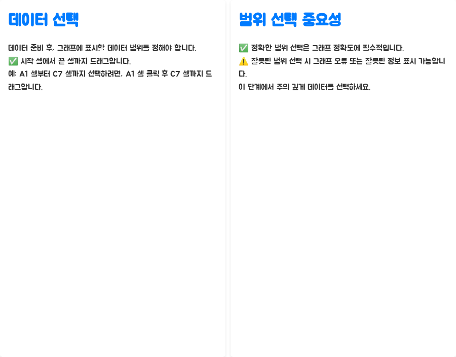 | 데이터 선택 | 그래프로 변환할 데이터 범위 선택 | 정확한 범위 선택이 그래프의 정확성을 결정 |