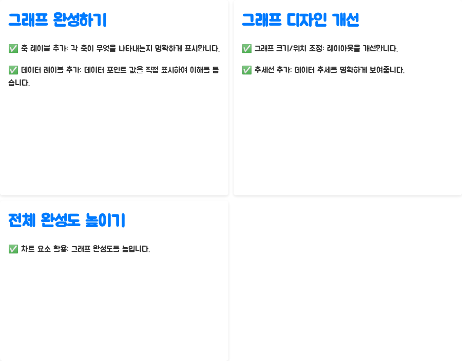 그래프의 크기와 위치를 조정하여 전체적인 레이아웃을 개선하고, 필요에 따라 추세선을 추가하여 데이터의 추세를 더욱 명확하게 보여줄 수 있습니다.