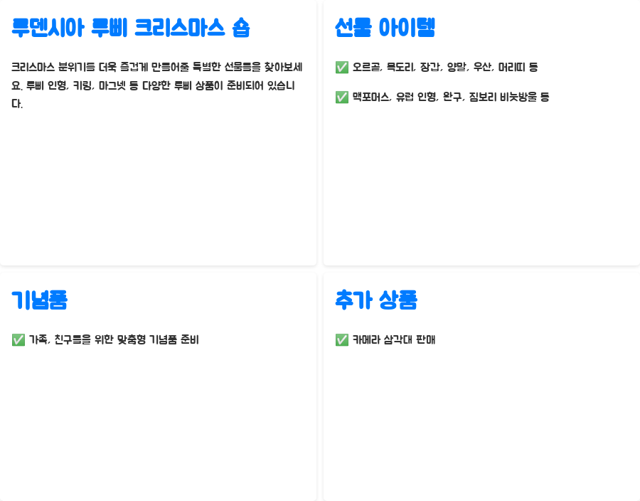 크리스마스 분위기를 더욱 즐겁게 만들어 줄 루덴시아 루삐의 크리스마스 숍도 빼놓을 수 없습니다.