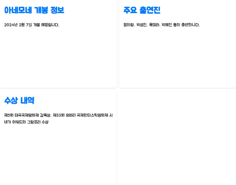 다른 출연진들 또한 각자의 개성을 드러내며 영화의 재미와 감동을 더할 것으로 기대됩니다. 이들의 연기 시너지가 '아네모네'를 더욱 특별한 영화로 만들어줄 것입니다.