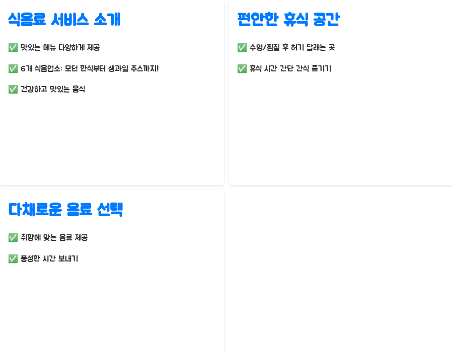 건강하고 맛있는 음식으로 몸에 활력을 더하고, 여유로운 시간을 보내세요. 수영이나 찜질 후 허기를 달래거나, 휴식 시간에 간단한 간식을 즐길 수 있는 완벽한 장소입니다.