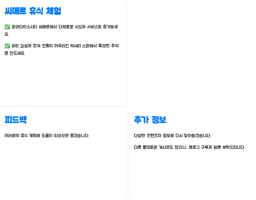 파라다이스시티 씨메르에서 즐길 수 있는 다양한 시설과 서비스에 대해 알아보았습니다. 유럽 감성과 한국 전통이 어우러진 럭셔리 스파에서 잊지 못할 추억을 만들어보세요!