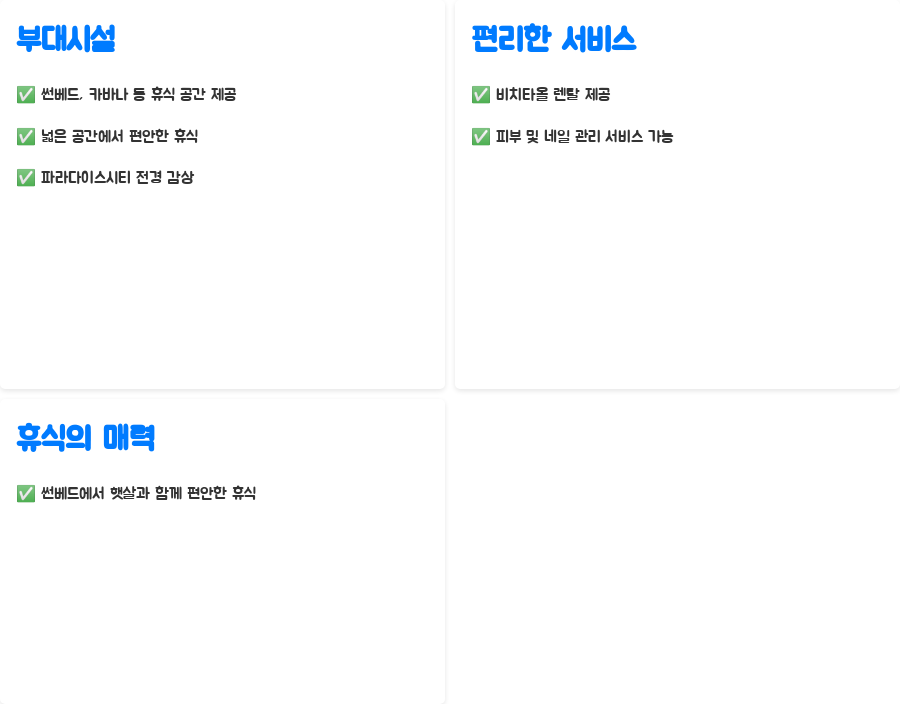 비치타올 렌탈 서비스도 제공하고 있어 더욱 편리하게 이용할 수 있습니다. 또한, 피부 및 네일 관리 서비스를 받으며 힐링 시간을 더욱 풍성하게 만들 수 있습니다.