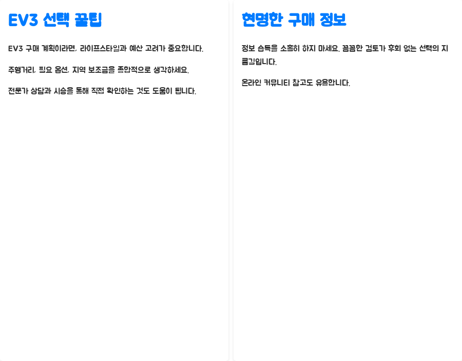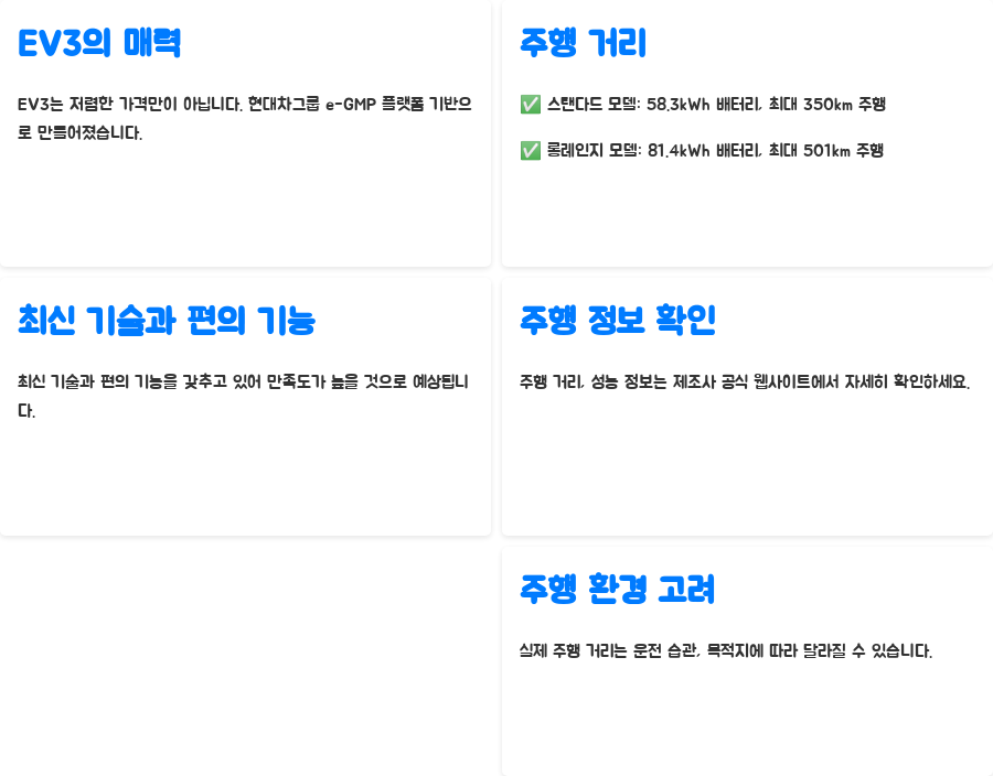 이 글이 여러분의 EV3 구매에 도움이 되었으면 좋겠네요! 더 많은 자동차 정보와 꿀팁을 원하신다면, 저희 블로그를 구독해주세요! 다음 포스팅도 기대해주세요!