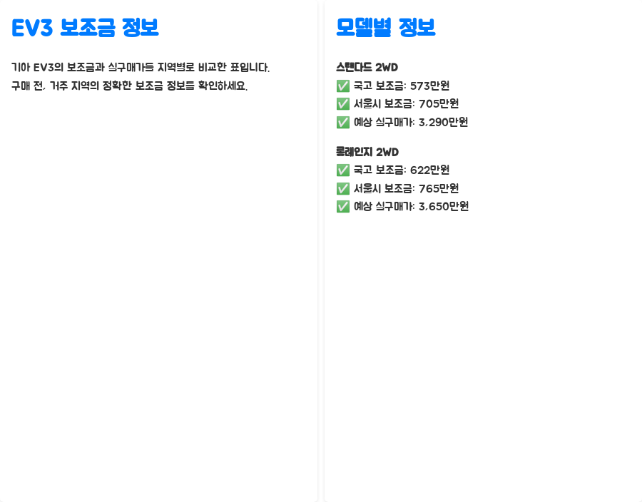 아래 표는 기아 EV3의 보조금과 실구매가를 한눈에 보여줍니다. 지역별 보조금 차이는 실제 구매 가격에 큰 영향을 미치므로, 구매 전 반드시 거주 지역의 보조금 정보를 확인해야 합니다.