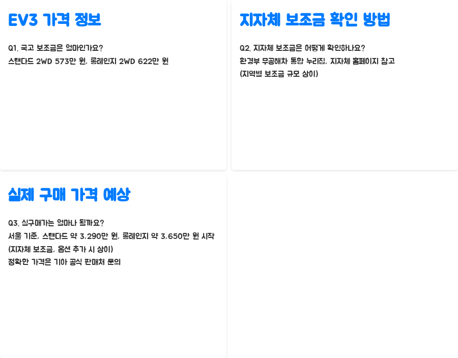 오늘 알아본 기아 EV3의 보조금 정보와 실구매가 어떠셨나요? EV3는 합리적인 가격과 뛰어난 성능, 그리고 다양한 편의 기능을 갖춘 매력적인 전기차입니다.